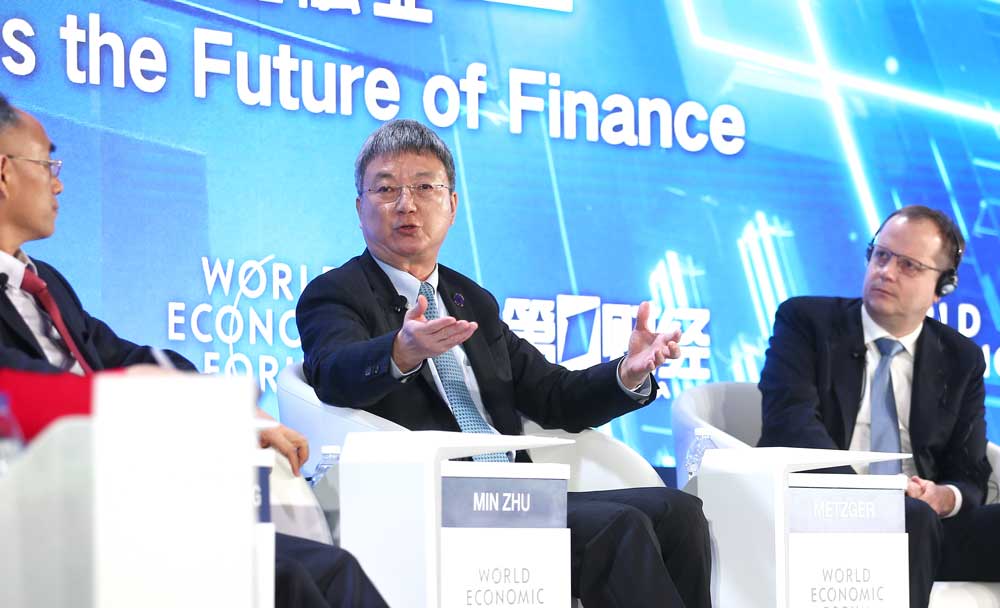 Zhu Min, center, chairman of the National Institute of Financial Research at Tsinghua University, speaks at the How China Shapes the Future of Finance forum, a sideline event at the Summer Davos Forum. [Photo by Zou Hong/China Daily]