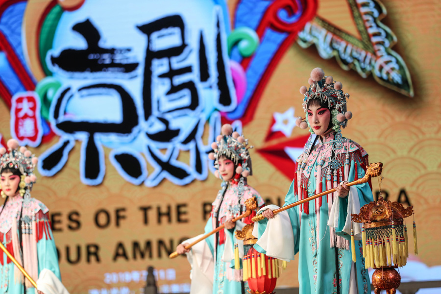 Peking Opera artists perform at the Dalian Night Gala during the 2019 Summer Davos Forum in Dalian, Northeast China's Liaoning province, July 1, 2019. The Forum organizer hosts a Peking Opera cultural tour where guests can watch opera performances, and experience the art in person for a closer look at Peking Opera culture. [Photo/Xinhua]