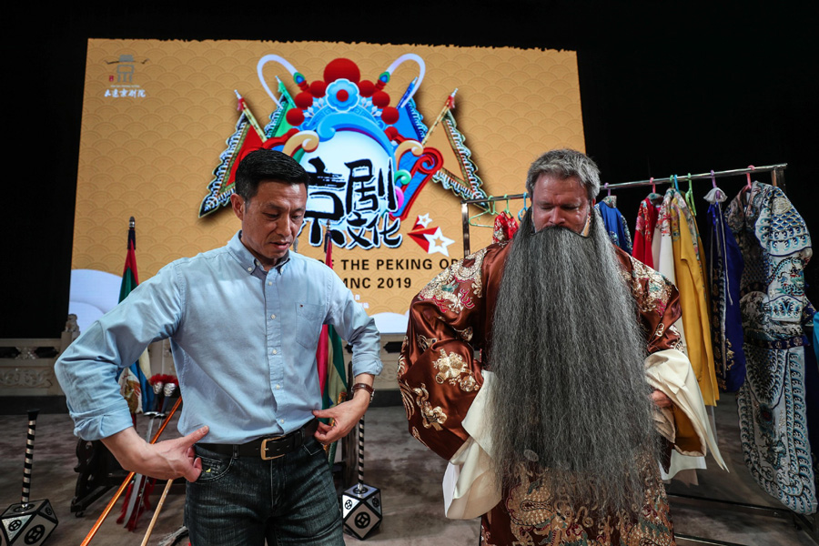 A guest learns to perform a Peking Opera movement under a performer's guidance during a Peking Opera cultural tour, an event held during the 2019 Summer Davos Forum in Dalian, Northeast China's Liaoning province, July 1, 2019. [Photo/Xinhua]
