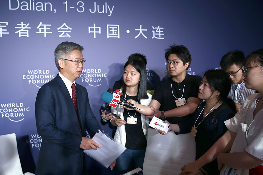 Huang Yiping, deputy dean of Peking University's National School of Development, is interviewed during the Annual Meeting of the New Champions 2019, also known as Summer Davos, in Dalian, Northeast China's Liaoning province, July 2, 2019. [Photo by Zou Hong/chinadaily.com.cn]