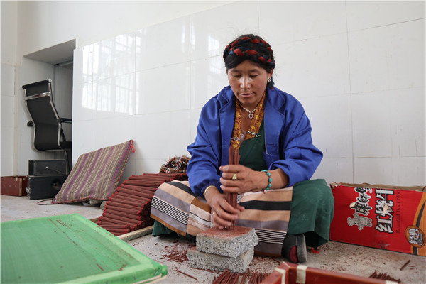 A Thonba villager in Tibet’s Nyemo county makes incense. [Photo by Palden Nyma]