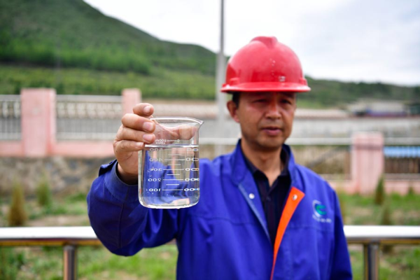 A worker shows journalists a sample glass of water after being dealt with at the sewage treatment plant in Huangyuan county, Xining, on June 19, 2019. [Photo/Xinhua]