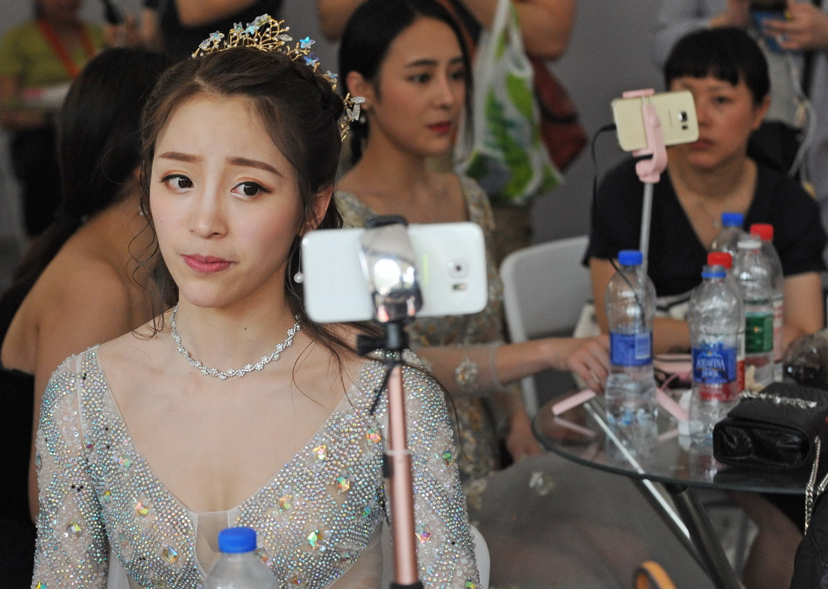An online celebrity reacts for her followers via a livestreaming app in Wuhan, capital of Hubei province. [Photo by Miao Jian/For China Daily]