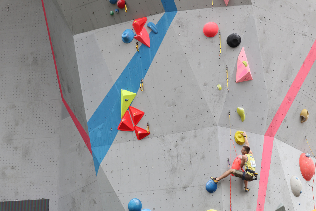 A participant climbs up the rock wall during the Belt and Road International Climbing Master Tournament 2019 in Lhasa on Wednesday morning. [Photo by Palden Nyima for chinadaily.com.cn]