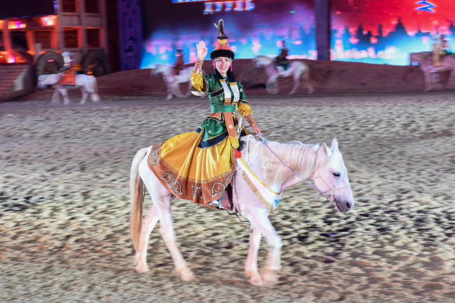 A Mongolian artist waves to the audiences at an equestrian performance center in Erenhot, north China's Inner Mongolia autonomous region, July 8, 2019. More than 50 Mongolian artists will stage over 100 equestrian performances from June to October to demonstrate local culture and equestrian stunts. Equestrian performances jointly produced by China and Mongolia since 2016 have not only become an integral part of cultural tourism industry in Erenhot, but also facilitated cultural exchange between the two countries.[Photo/Xinhua]