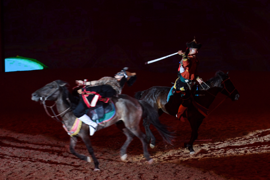 Mongolian artists perform at an equestrian performance center in Erenhot, north China's Inner Mongolia autonomous region, July 8, 2019. More than 50 Mongolian artists will stage over 100 equestrian performances from June to October to demonstrate local culture and equestrian stunts. Equestrian performances jointly produced by China and Mongolia since 2016 have not only become an integral part of cultural tourism industry in Erenhot, but also facilitated cultural exchange between the two countries.[Photo/Xinhua]