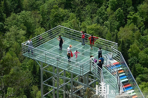 Tourists are amazed by the forest scenery, while aloft on a glass-made sightseeing platform in Luolemi Mountain Scenic Area. [Photo/dbw.cn]