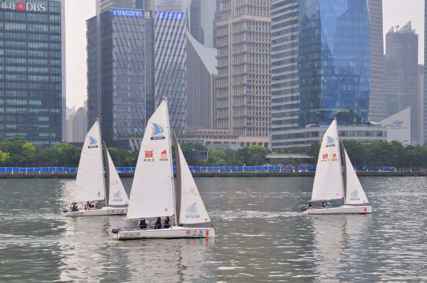 Shanghai's Huangpu River is dotted with 15 white sailboats on Thursday morning as they sailed across the river to celebrate the 15th Maritime Day, which fell on July 11. [Photo provided to chinadaily.com.cn]