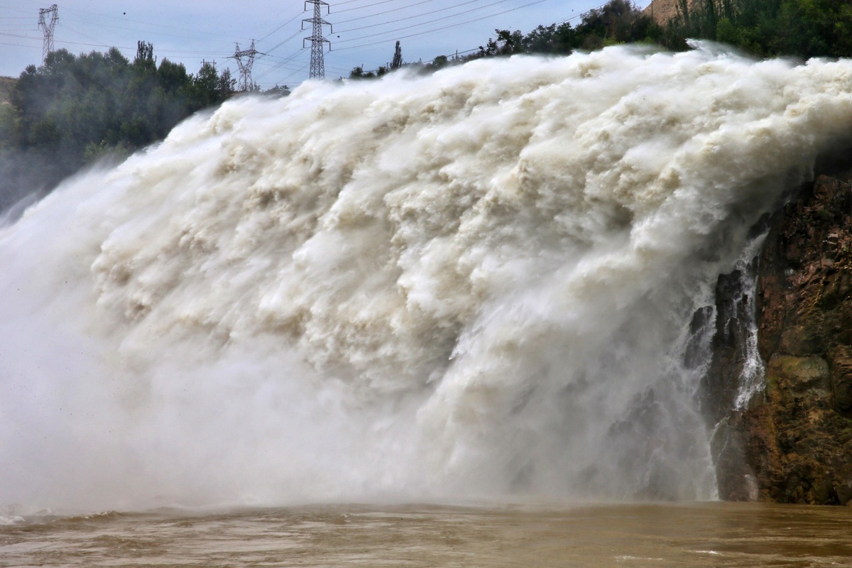 An aerial view of Liujiaxia Dam, which has opened its gates to release water, in Northwest China’s Gansu province, July 1, 2019. [Photo by Tian Xi/for chinadaily.com.cn]