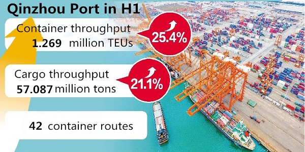 In the first half of 2019, Qinzhou Port completed a port cargo throughput of 57.09 million tons, a year-on-year increase of 21.1 percent. Its container throughput reached 1.27 million TEUs, an increase of 25.4 percent.