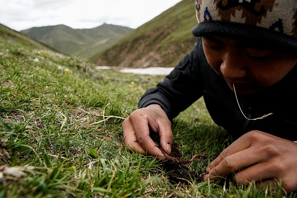 A picker digs out some caterpillar fungus near Animaqin Snow Mountain. [Photo/VCG]