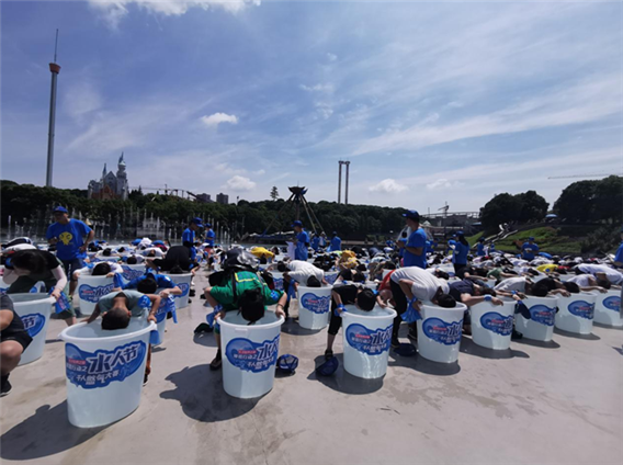 Participants in a contest to hold their breath dunk their heads into the water at the moment the game begins at the Window of the World Park in Changsha, capital of Central China's Hunan province, July 6, 2019. [Photo provided to chinadaily.com.cn]