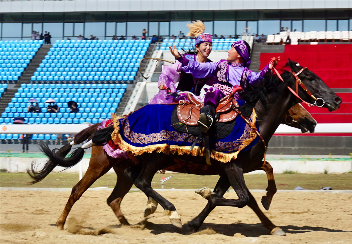 Equestrians from Xinjiang Uygur autonomous region demonstrate the traditional Khiz Khuar performance at the 11th Traditional Games of Ethnic Minorities of China in Hohhot, Inner Mongolia autonomous region. [Photo by Pan Qi, Jiang Sisi/chinadaily.com.cn]