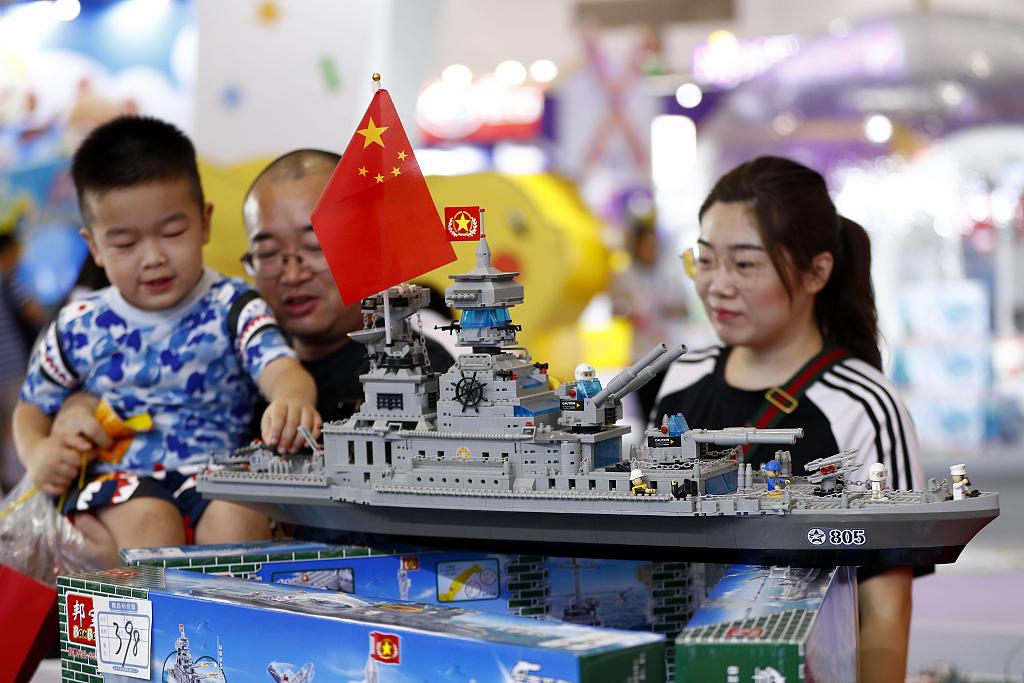 Visitors look at a warship-shaped splicing toy at the Kids Fun Expo underway in Beijing, July 11, 2019. [Photo/VCG]
