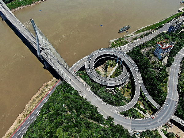 An aerial view of the sprial overpass connecting with the Fuling Yangtze River Bridge at the southern river bank in Fuling district in Southwest China's Chongqing, July 14, 2019. [Photo/VCG]