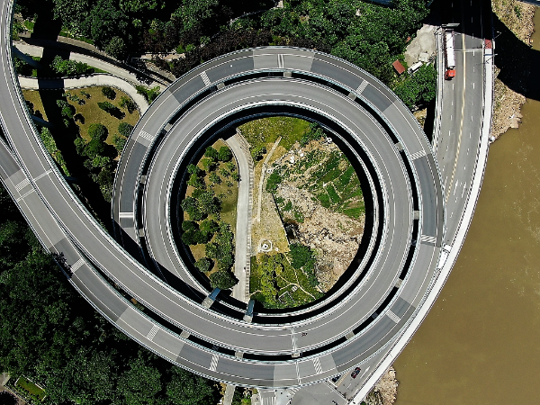 A bird's-eye view of the sprial overpass connecting with the Fuling Yangtze River Bridge at the southern river bank in Fuling district in Southwest China's Chongqing, July 14, 2019. [Photo/VCG]