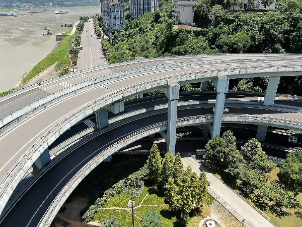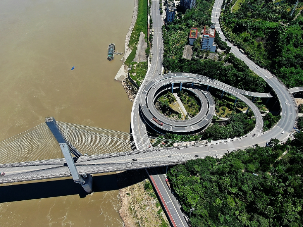 Loop lanes of the the sprial overpass connecting with the Fuling Yangtze River Bridge at the southern river bank in Fuling district in Southwest China's Chongqing, July 14, 2019. [Photo/VCG]
