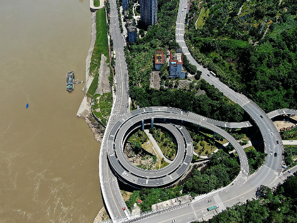An aerial view of the sprial overpass connecting with the Fuling Yangtze River Bridge at the southern river bank in Fuling district in Southwest China's Chongqing, July 14, 2019. [Photo/VCG]