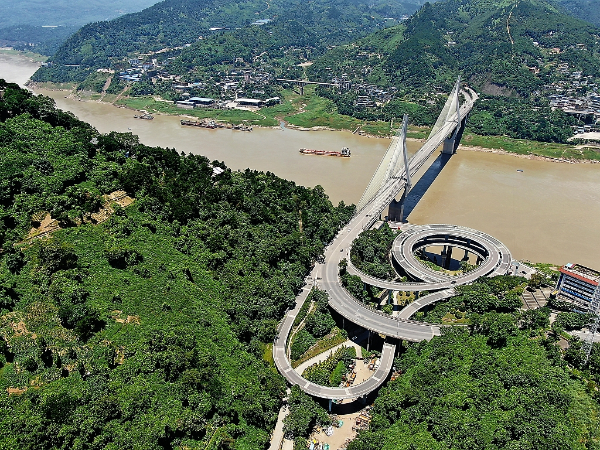 An aerial view of the sprial overpass connecting with the Fuling Yangtze River Bridge at the southern river bank in Fuling district in Southwest China's Chongqing, July 14, 2019. [Photo/VCG]