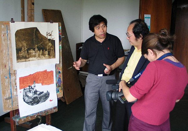 He says that China's woodblock printing was well developed, but the country's artisans had few contacts with Western-style copper-plate etching in the 1990s.