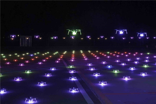 The 200 drones, all controlled by a computer, can make a variety of flexible designs for a performance in Xinmi, Central China’s Henan province, Saturday night. [Photo provided to chinadaily.com.cn]