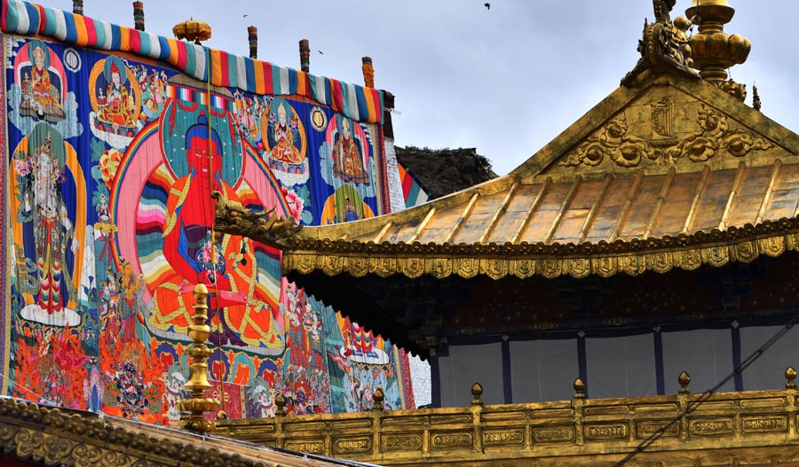 A giant Thangka painting is displayed at the Tashilhunpo Monastery in Xigaze, Southwest China's Tibet autonomous region, July 15, 2019. Thangka are Tibetan Buddhist artworks painted on cotton or silk. The religious paintings can be traced back to the 10th century and typically depict Buddhist deities. [Photo/Xinhua]