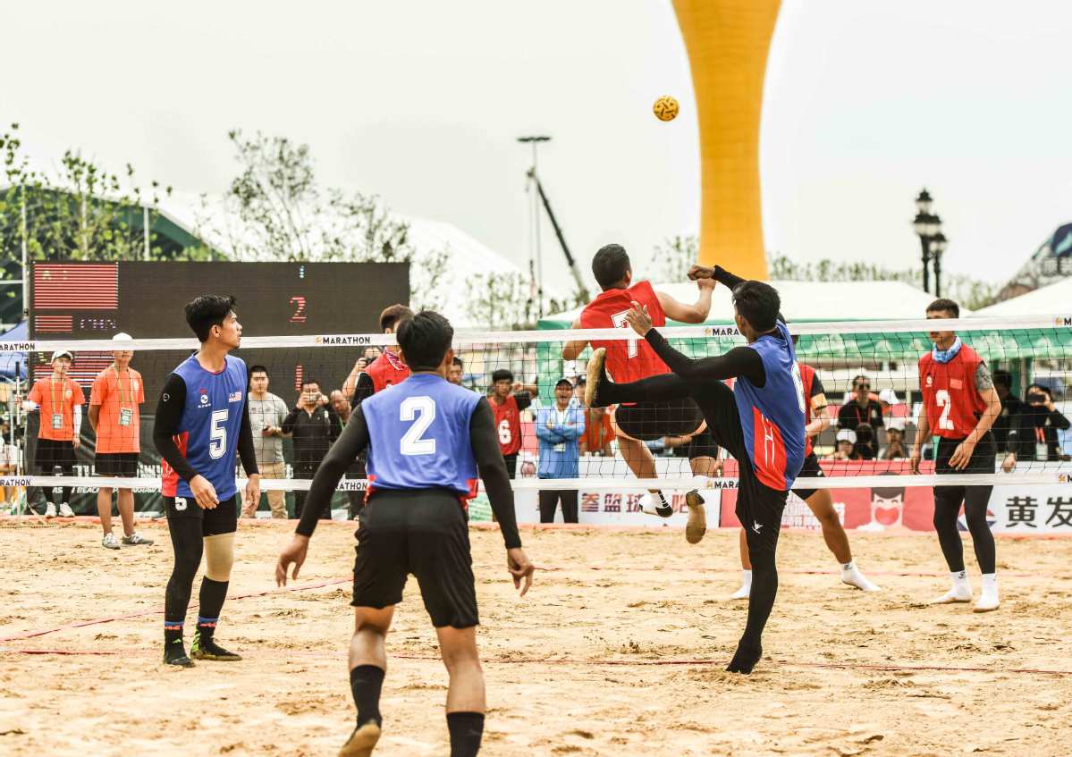 Players compete during the 2019 Asian Beach Sepak Takraw Championships in Qingdao, Shandong province. [Photo by Zhou Huilong/for chinadaily.com.cn]