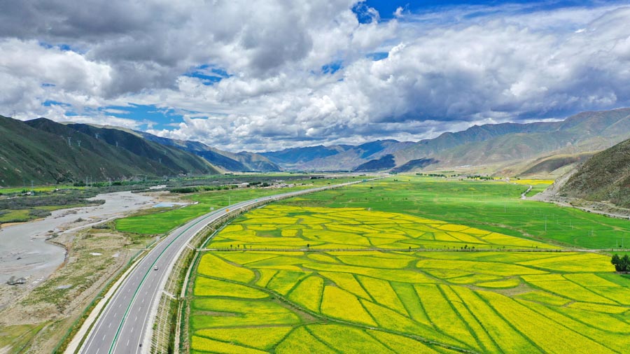 (highland barley) fields and blooming canola flowers along the highway linking Lhasa with Nyingchi in Tibet autonomous region, July 16, 2019. [Photo/Xinhua]