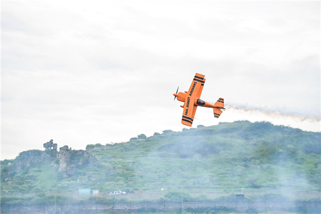 An aerobatic pilot performs during the 2019 Guizhou Huangguoshu Waterfalls Flight Conference in Anshun city, Guizhou province on July 19, 2019. [Photo provided to chinadaily.com.cn]