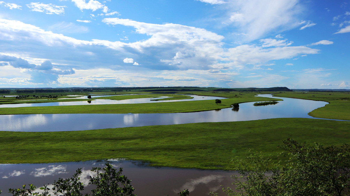 Blue sky and clear lakes at the grasslands in Daur Autonomous Banner, Morin Dawa, North China's Inner Mongolia autonomous region. [Photo by Jiang Xiwu/chinadaily.com.cn]
