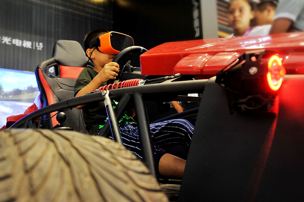 A boy tries out VR technologies to drive on a racing simulator at the 2019 China International Consumer Electronics Show in Qingdao, East China's Shandong province, July 21, 2019. [Photo/VCG]