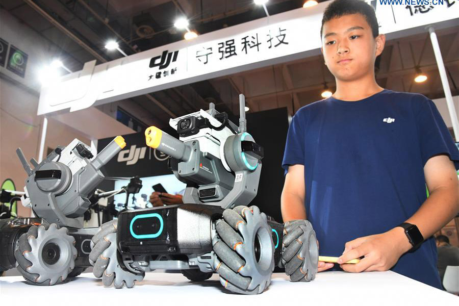 An exhibitor manipulates a robot at the 2019 China International Consumer Electronics Show in Qingdao, East China's Shandong province, July 19, 2019. [Photo/Xinhua]