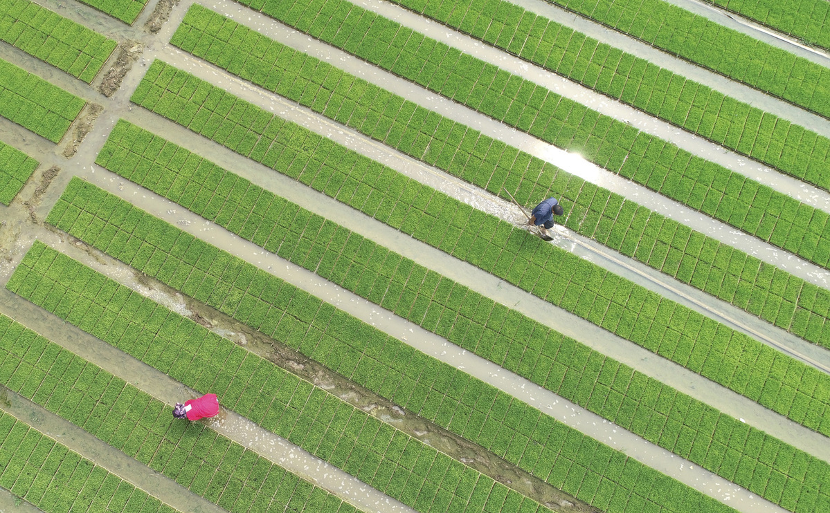 Villagers arrange paddy seedlings in a field in Yinan county, Linyi city of East China's Shandong province, June 21, 2019. [Photo/Xinhua]