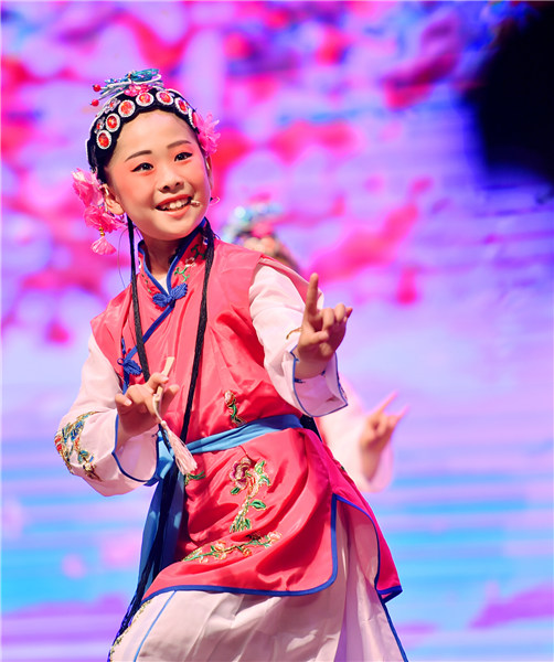 A student performs a classical musical piece from Peking Opera at the cultural festival held at a local primary school in Shijiazhuang, North China's Hebei province, on June 11, 2019. [Photo/Xinhua]