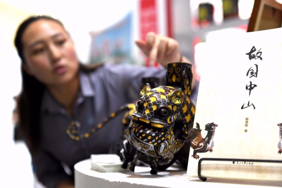 A staff member introduces a cultural and creative product during the 4th Shijiazhuang Tourism Industry Development Conference in Lingshou county of Shijiazhuang, capital of north China's Hebei province, June 27, 2019. The conference opened here on Thursday.[Photo/Xinhua]