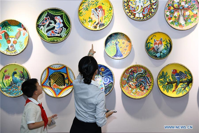 A teacher and a student view art works during the 2019 China-ASEAN Education Cooperation Week in Guiyang, capital of southwest China's Guizhou Province, July 22, 2019. [Photo by Yang Wenbin/Xinhua]