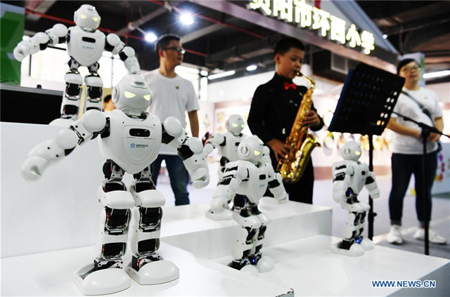 A student (2nd R) plays saxphone as he interacts with robots during the 2019 China-ASEAN Education Cooperation Week in Guiyang, capital of southwest China's Guizhou Province, July 22, 2019. [Photo by Yang Wenbin/Xinhua]
