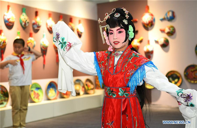 A student performs Peking Opera during the 2019 China-ASEAN Education Cooperation Week in Guiyang, capital of southwest China's Guizhou Province, July 22, 2019. [Photo by Yang Wenbin/Xinhua]