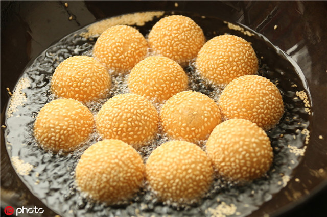 Deep-fried sesame balls, a fried sweet dish made of glutinous rice balls coated with sesame seeds, are stuffed with sweetened bean paste, shredded coconut or sesame paste with sugar. They are considered a "lucky food" and are prepared on holidays. To make them, you need to use a strainer to move the rice balls in circles in very hot oil. As the ingredients expand, the action is related to the Chinese character fa, which means fortune, and people believe that deep-fried sesame balls are a kind of auspicious food that will bring in gold and silver.