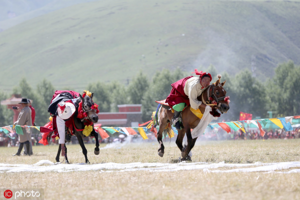 Riders demonstrate equestrian skills at the opening ceremony of a traditional horse racing festival in Yushu, Northwest China's Qinghai province, July 25, 2019. The five-day event kicked off on Thursday. [Photo/IC]