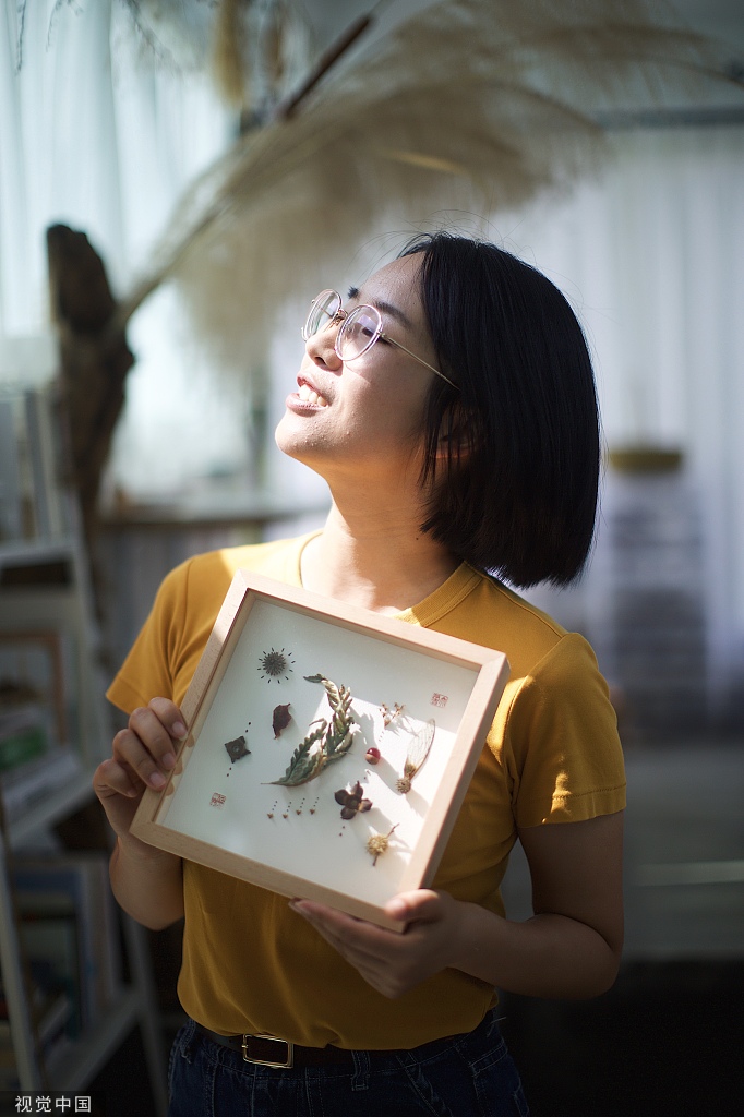 Liu Liu holds a piece of ornament made by plants and other materials in Hangzhou, East China's Zhejiang province, July 28, 2019. [Photo/VCG]