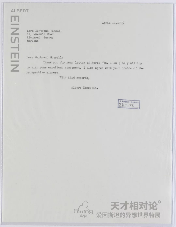 Einstein's last letter to philosopher Bertrand Russell discussing what was later known as the Russell–Einstein Manifesto. [Photo provided to chinadaily.com.cn]