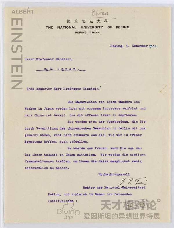 A letter to Einstein by the then Peking University president Cai Yuanpei in 1922, inviting Einstein to visit China on his trip to Japan. [Photo provided to chinadaily.com.cn]