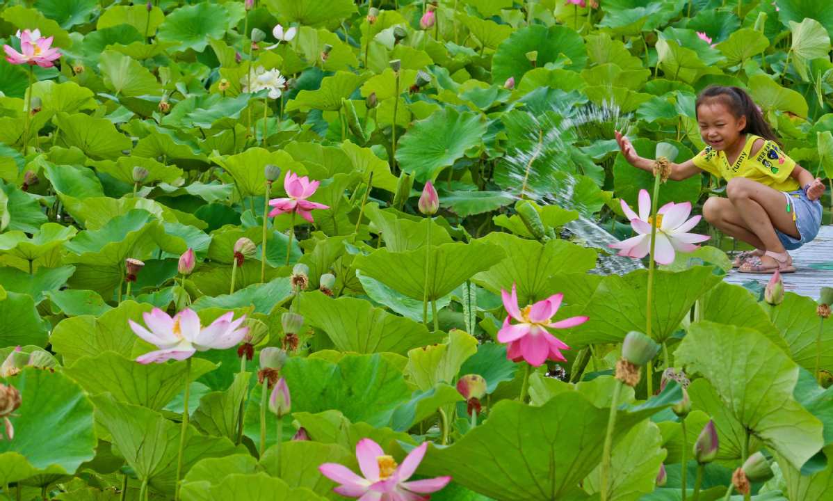 Tourists enjoy flowers and play on the lotus pond viewing platform in Zhangye national wetland park, Northwest of China's Gansu province, on Aug 3, 2019. [Photos by Wang Jiang/for chinadaily.com.cn]