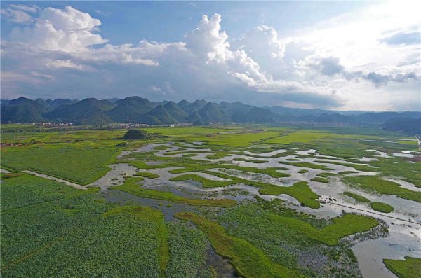 Aerial view of Yunnan wetland park reveals lushly green landscape