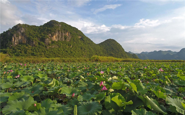 A vast spectrum of lotus flowers blankets the rich green landscape punctuated by rugged mountains in Puzhehei National Wetland Park in Qiubei county, Southwest China's Yunnan province, on Aug 7, 2019. [Photo/Xinhua]