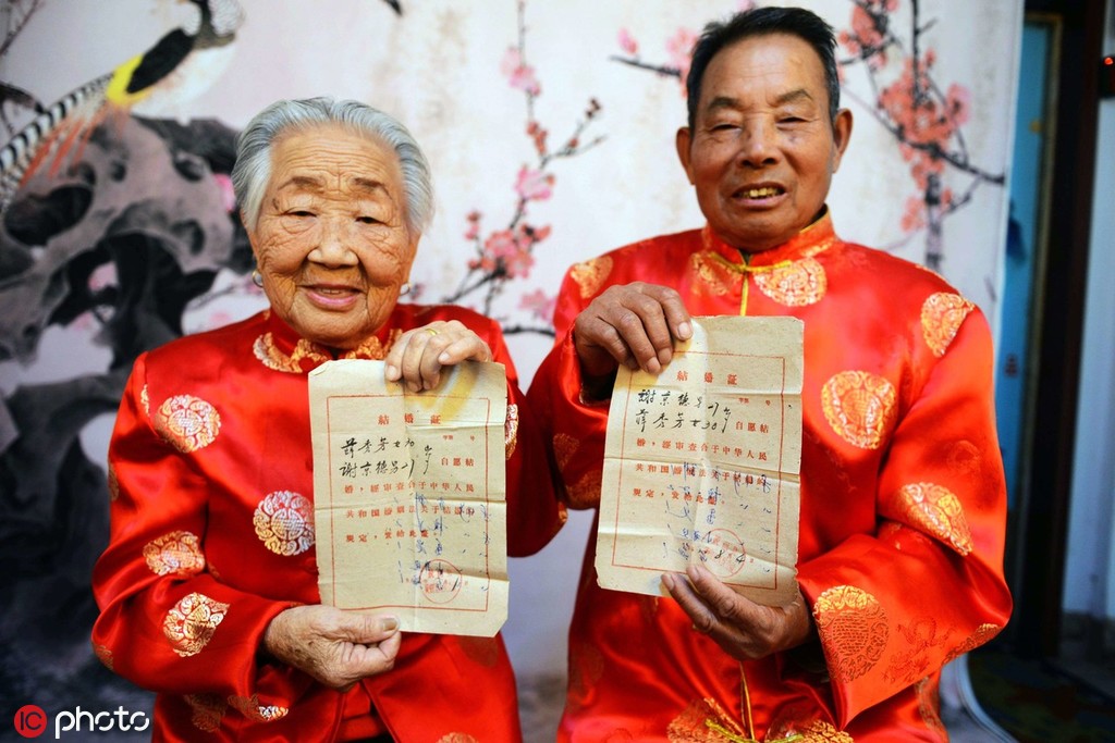 An old couple, Xue Xiufang, left, and Xie Jingde in Qingdao, East China's Shandong province, show their marriage certificates from 1962 on Oct 12, 2013. [Photo/IC]