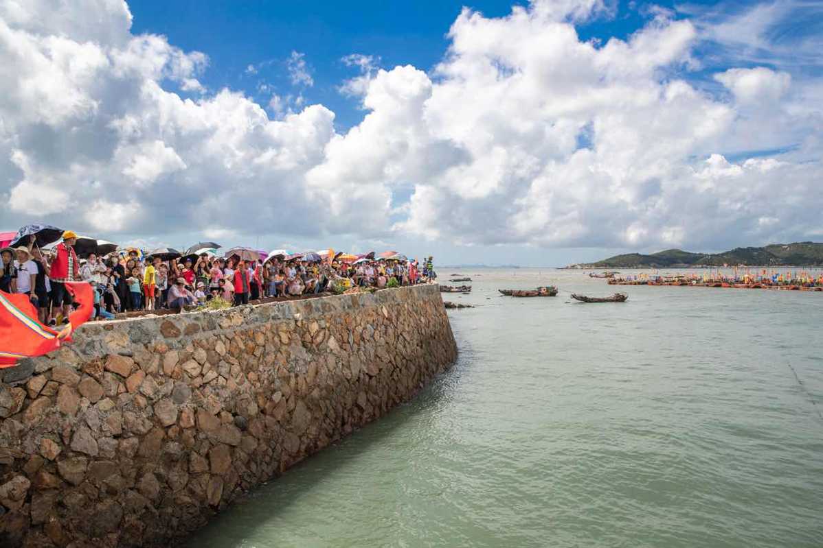 Festivalgoers watch fishing boats head out to sea in Shapu town, Fuqing city of East China's Fujian province, Aug 3, 2019. [Photo by Chen Wenfan and Chen Naiying]