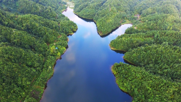 Varying shades of deep green and blue create a placid picture in this aerial photo of Taiyang Lake, Shizhu Tujia autonomous county in Southwest China's Chongqing municipality, on Aug 8, 2019. With an average altitude of 1,450 meters, the lake is renowned for its mesmerizing natural scenery. [Photo/Xinhua]