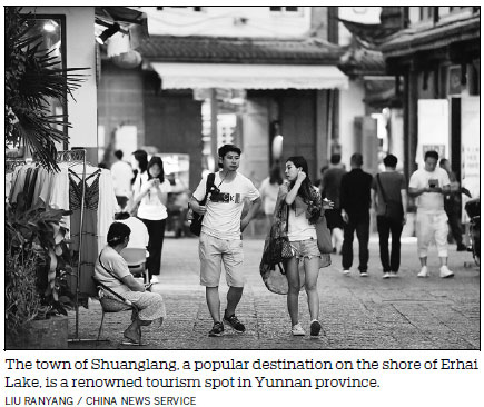 The town of Shuanglang, a popular destination on the shore of Erhai Lake, now attracts about 15,000 tourists a day, with nearly 12,000 staying in local hotels and guesthouses.